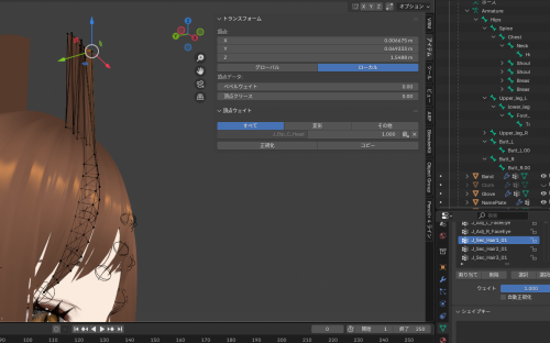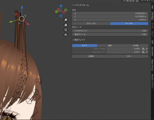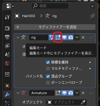 Blender 2025.11.22 Blender4.5環境、Auto-Rig Proのスキンメニューで、衣服などのオブジェクトをARPのリグにバインドさせて 衣服を着せた後、ポーズモードで動作確認した際に一部の頂点が取り残されて伸びた際の修正方法 ※編集モードにするとメッシュがレストポーズに戻る場合は、スパナマークのモディファイアーの中で、「編集モード中にもモディファイアーを表示」をチェックしておく。 原因の特定 まずは正常に動作している頂点を選び、アイテムの中の頂点ウェイトを見る。 原因と対策 次に異常が出ているメッシュを見る。頂点グループで抜けを見つけて、オブジェクトデータプロパティからその頂点グループに割り当てる。