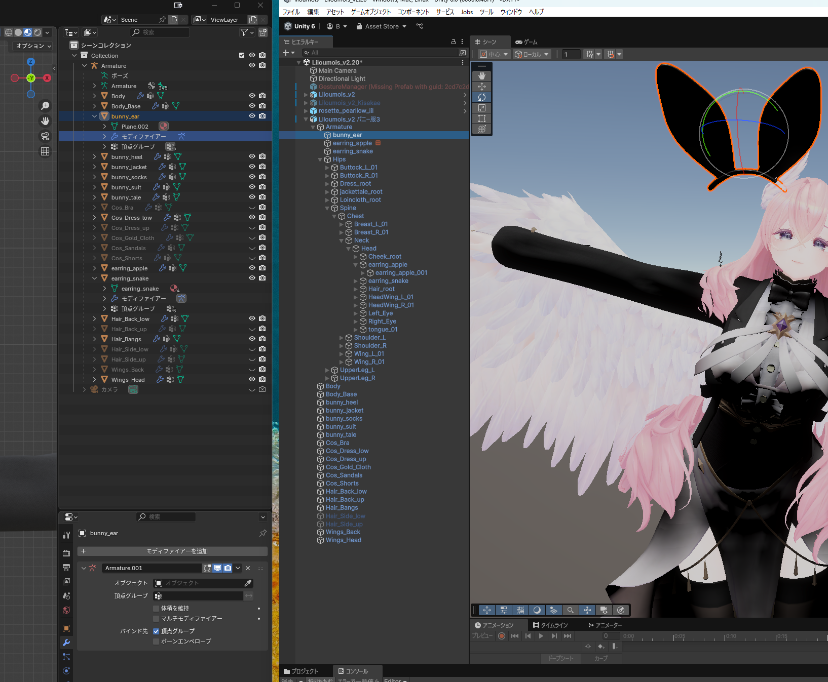 Blender 2025.08.31 Blenderのアウトライナーではアーマチュア、メッシュ共に正しく配置できているように見えても UnityにFBXインポートするとメッシュがアーマチュアの中に入り込んでしまう。 原因: Blender側のメッシュのモディファイアーで、Armatureのオブジェクトが外れていることがある。 切り分け: Unityに持っていってMagicaCloth2を適用したところボーンは動いていて、メッシュが付いてこない。でもBlenderでウェイトペイントは正しくできている。